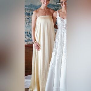 Chic strapless dress by Anna Quan. Soft yellow hue. Ideal for elegant events.
