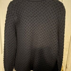 Elegant black zip-up sweater. Features textured knit design. Ideal for layering.