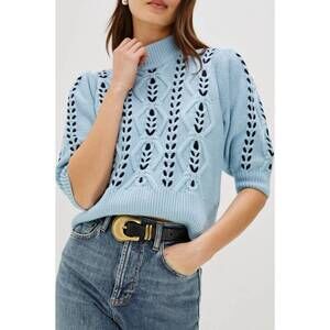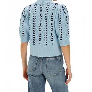 Discover the Women's Addy Mock Neck Sweater by Rails, an ideal option for a vacation-ready, Boho Chic look. This patterned sweater comes in a playful Sky Navy Cables color, highlighting its short sleeves and trendy mockneck. Made from a cotton blend composed of 55% Cotton, 37% Nylon, and 8% Wool, it ensures comfort and style. Designed for fall, this pull-on cardigan requires dry cleaning for care.