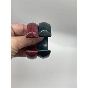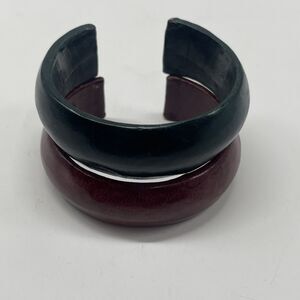 These beautiful cuff bracelets look to be handmade. Covered in dy ed leather with rich colors of emerald green and burgundy wine. Measuring for a 6 1/2 inch wrist. In great preowned condition but each bracelet has one small little scuff on the edge ( shown in the last picture ). Looks great worn together or worn separately. Comes from a smoke free home.