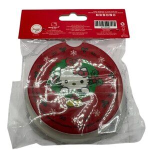 Keep your car clean as you travel to visit loved ones by using these Hello Kitty Car Coasters. These red coasters are embellished with holly leaves, snowflakes, and Hello Kitty's iconic bow along the edge. Hello Kitty is wearing a wreath on one coaster, while she enjoys a cup of hot chocolate on the other. With a notch at the top, these round coasters are easy to place and remove when needed!