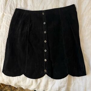Stylish black skirt with button-up front. Features a unique scalloped hem. 100% leather, looks like suede. I can’t remember where I got it, but I’ve worn it maybe twice and now no longer fits. EUC. Non-smoking, make an offer!