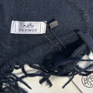 Luxurious Hermes scarf in deep blue. Features elegant fringe accents. Ideal for stylish layering.