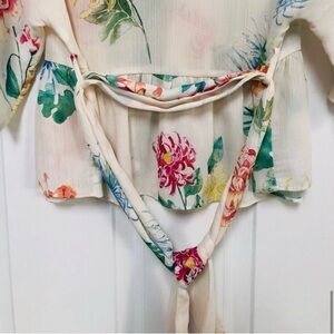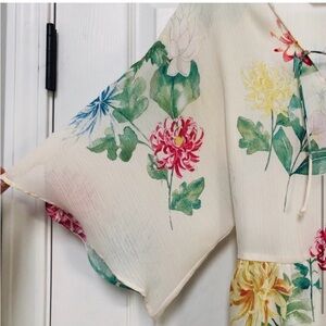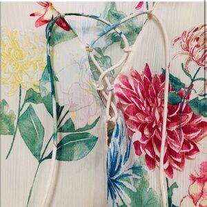 ruffle/peplum hem. Flowy 3/4 sleeves. 18” pit to pit. Criss cross ties. Smoke/pet free home. Fast shipper. Never worn. In excellent condition! BUNDLE AND SAVE ON SHIPPING!