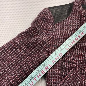 Chic tweed jacket in burgundy. Features black quilted accents. Perfect for stylish occasions.
