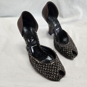 Vintage PRADA Women's 38 Brown Tweed Leather Peep Toe D’Orsay Heels Pumps *Flaw*