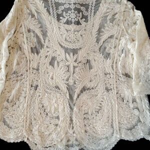 Vintage-style, delicate lace top in pre-owned excellent condition. Scalloped edge along sleeves and bottom. Three quarter sleeves.