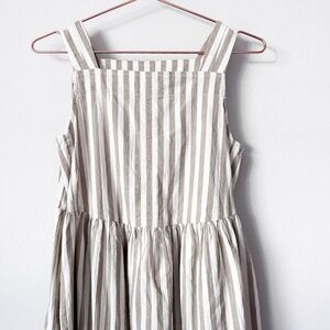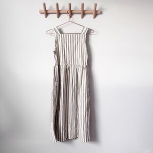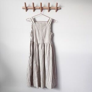 In excellent condition with no visible flaws midi dress with a square neckline. Features beige and white stripes. Ideal for casual wear. This dress has pockets.