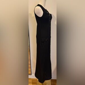 Chic black midi dress by Commense. Features gold button details and bow accents. Ideal for versatile styling. The image where the button looks red is just a reflection :)