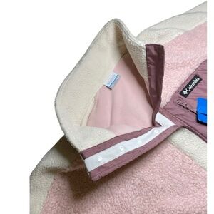 Cozy and stylish Columbia sherpa fleece pullover in a soft pink and cream colorblock design. Features a half-zip mock neck, snap/zip chest pocket with Columbia logo, and ultra-soft plush fleece for warmth and comfort. Perfect for casual wear, travel, hiking, or lounging in cooler weather.