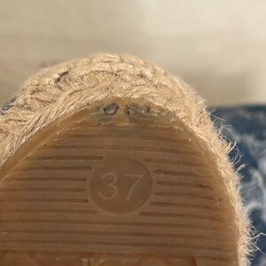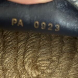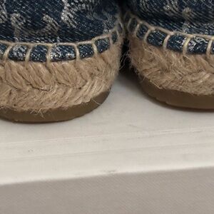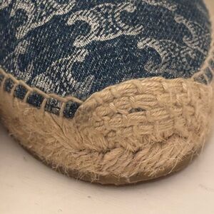 Elegant Celine espadrilles in blue denim color with silver print logo. Features classic woven tan sole. Shoes are in good condition, only one small scuff on the sole of one shoe. Comes with box, dust bags and authenticity card.
