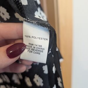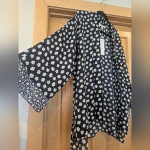 Chic black kimono blouse with white floral design. Lightweight and versatile. Perfect for layering.