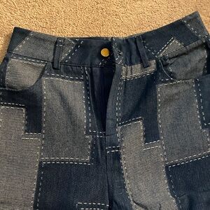Trendy pants with a patchwork pattern design. Perfect for casual outings.