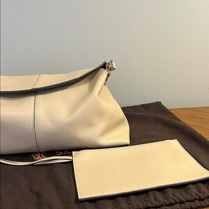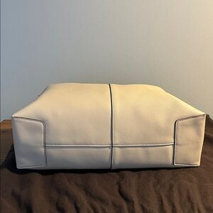 Chic cream shoulder bag by Tod's. Features elegant gold accents. Perfect for versatile styling.