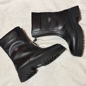 Sleek black design with sturdy sole. Iconic Harley-Davidson logo. Ideal for rugged style. These are zip up boots.