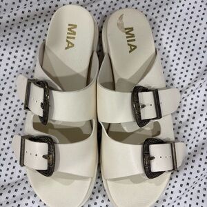 Step out in style with these MIA women's sandals. Featuring a chic cream color, these sandals are perfect for any casual outing. Enjoy comfort and elegance with every step.
