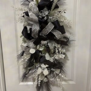Enhance your holiday decor with this elegant black and silver door swag. Perfect for adding a touch of sophistication to your home.