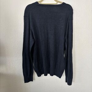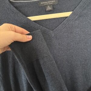 Keywords: Banana Republic sweater, mens knitwear, silk blend, cotton cashmere, luxury knit, dark navy sweater, V neck pullover, long sleeve top, mens wardrobe staple, soft sweater, versatile knit, fall fashion, winter essential