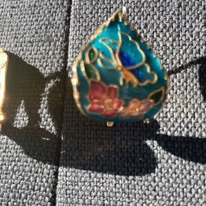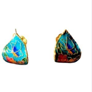 Vintage Enamel Cloisonné vivid butterfly floral leaf motif clip on back earrings