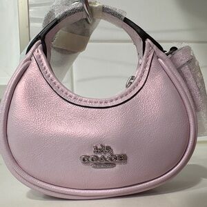 Elegant Coach clutch with floral embellishments. Features pink and yellow flower accents. Ideal for versatile styling.