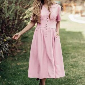 This elegant pink dress features a stylish button-down front, perfect for any occasion. Its soft fabric and flattering fit make it a must-have in your wardrobe. Accentuates in all the right places for us thicker ladies! Good quality seam and adorable style!