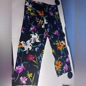 Vibrant floral print pants with a black base. Features colorful flowers in shades of pink, orange, yellow, and blue.