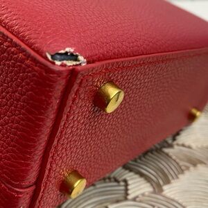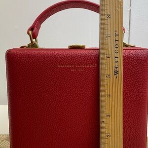 Chic and sophisticated red leather satchel by . Perfect for adding a pop of color to your ensemble. This is a beautiful bag . Has damage to all 4 corners. No crossbody strap. Can be repaired. Clean inside.