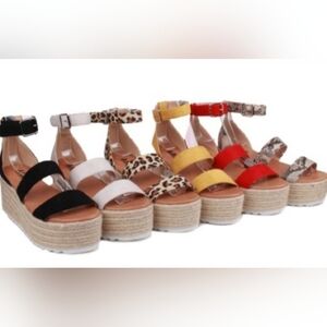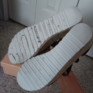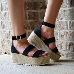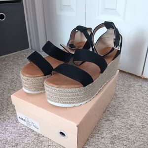 Black strappy espadrilles platform wedges. Adjustable ankle strap. Sooo cute and trendy! Size 7.5, but fit like an 8. Worn only once. Comes with original box. I hate to sell these beauties, but I need to purge my collection to make some room :-/