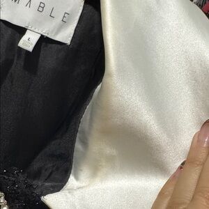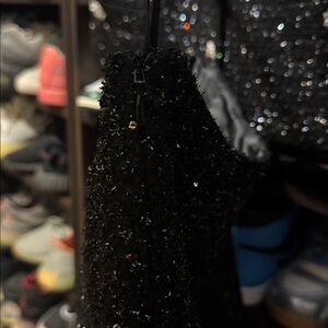 Preloved, worn only once in excellent condition. Short sleeve sequin tweed contrast peter pan collar rhinestone button down jacket and matching mini skirt set. Lining. Has a little makeup on the collar but can be cleaned.