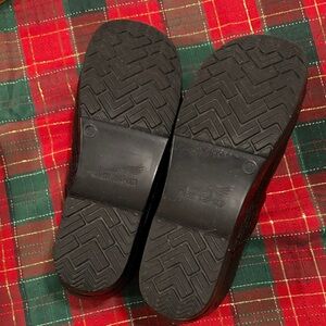 Broken in mules/clogs with textured design black. Clean Cozy and durable. Stylish and comfortable work shoes!