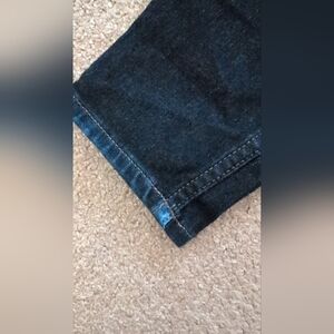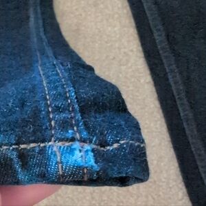Good pre-loved condition, with a flaw on the bottom left leg. It is a slight denim rip from normal wear and tear is appears a brighter blue in the picture than it really is.