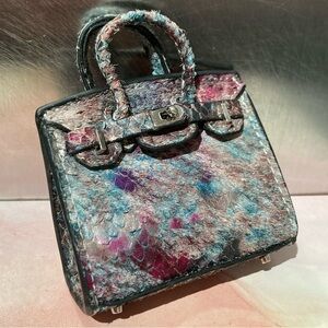 πŸ‘œ This elegant handmade genuine leather mini Birkin bag charm features an unique iridescent textured design in multicoloured (watercolor-inspired gradient) fish scale print. πŸ‘œ Its sleek design & luxurious texture make it a standout accessory for any occasion. Perfect for adding a touch of sophistication to any handbag πŸ‘. βœ¨πŸ‘œπŸŒŸRare & Limited Edition: One of a kind, there is no identical other available as it is made with rare genuine leather such as python, snakeskin, crocodile, fish etc. πŸ‘œ This miniature toy version can hold small accessories such as AirPods, Keys πŸ”‘, jeweley etc. Although it is more recommended for collectible purpose due to the rare edition & fine craftsmanship. πŸ‘œ size: Approx. 7.2cm W x 7cm H x 3.6cm D [with handle] Approx. 7.2cm W x 9.5cm H x 3.6cm D πŸ‘Comes with luxurious thick velvet dust bag + keychain attachment + colorful strap to hang. πŸ‘œ Last 3 pictures: sample of how this style of bag can be opened & when hang on a bag.