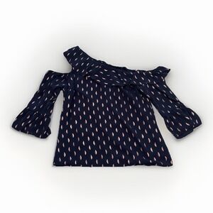 This Anthropologie off-shoulder navy blue blouse features a flattering off the shoulder neckline and 3/4 flutter sleeves, perfect for a casual or dressed-up look. The rose gold accents add a touch of elegance, making it a versatile piece for any wardrobe. Made from polyester, this top is designed in a size small and is a stylish addition to any woman's clothing collection. Its timeless appeal and classic color combination make it a staple piece for the modern fashion-forward woman.