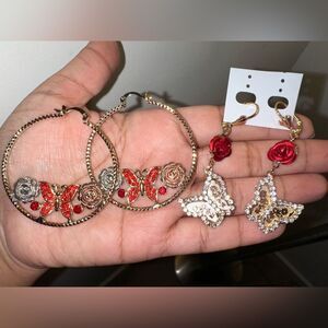 These stunning earrings feature intricate butterfly and rose designs in vibrant red and shimmering gold. Perfect for adding a touch of elegance to any outfit.