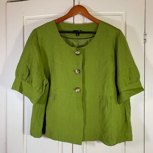 East 5th Green Linen Blend Peplum Blouse XL Button Front Short Sleeve Cottage