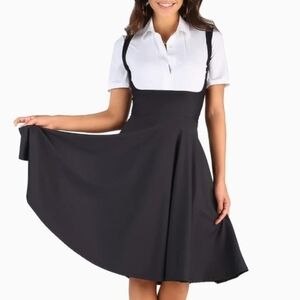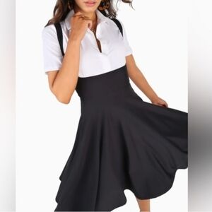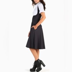 "Part pinafore and part corset, this matte black midi dress is designed to show off all your cutest tops. It looks amazing with button-ups, crops, tees, swimsuits - pretty much anything you wanna rock. It can also be worn back-to-front as a high-neck, low-back staple piece. You'll pretty much wanna rock this one all day, erryday.
