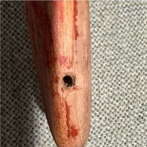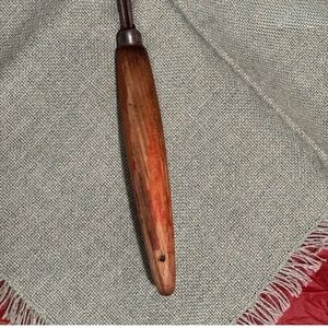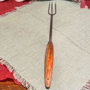 Wooden handle carving fork. Very worn. Some rusting. Some wood missing on back of handle where it looks like the wood cracked when someone drilled a hole into the wood. This is a meat fork but it is also long enough to roast marshmallows.