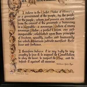 This is a framed vintage 1957 copy of The American's Creed, produced by J.R. Rosan Studio in Boston. A patriotic and historical piece, perfect for Americana collectors or wall décor. Please note the paper shows visible wrinkling consistent with age.