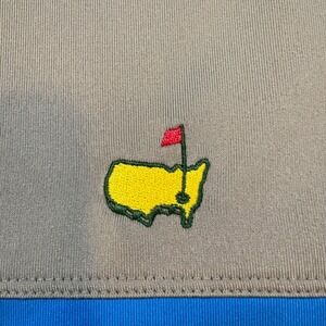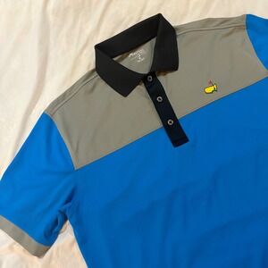 Masters Tech golf polo shirt in blue and gray with an embroidered Masters logo. This short-sleeve polo features a classic collar and a three-button placket. Perfect for a round of golf, casual wear, or showing your support for the Masters Tournament.