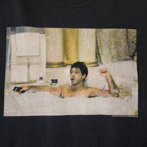American Classic Men's Black Tagless Tee from the movie "Scarface" with Al Pacino character in the famous bathtub scene. Perfect for casual outings. Great nostalgia with vintage Y2K vibes. Little baggy, regular classic fit.