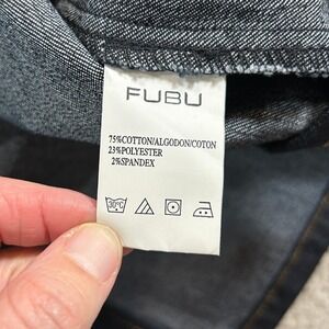 Keywords: FUBU, denim, trench coat, double breasted, belted, dark wash, menswear, outerwear, streetwear, indigo, classic, fashion, jeans jacket