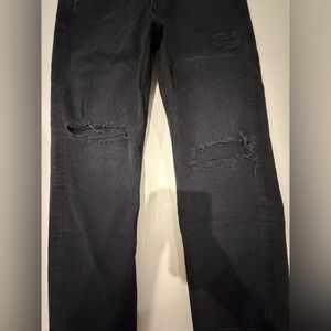 Classic black straight jeans with distressed details. Ideal for everyday wear.
