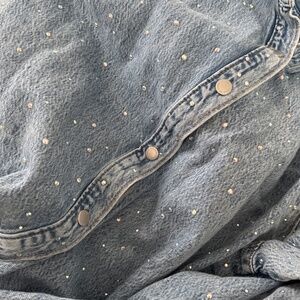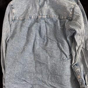 Jean button down covered in rhinestones front to back that shine bright in light! Button down and can be worn open or closed (sleeves can be left unbuttoned)