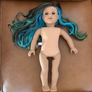18” American Girl doll with vibrant brown and blue hair. Doll #89 of Truly Me collection. No clothing included. Some scuff marks to legs as seen in photos.