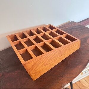 8 3/4” wide by 10 1/4” long. Compartments are 2 1/2” x 1 1/4” and approx 1 3/4” deep.