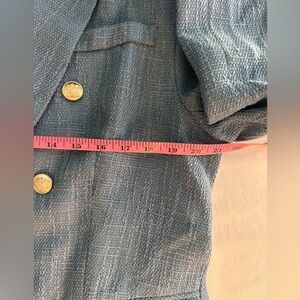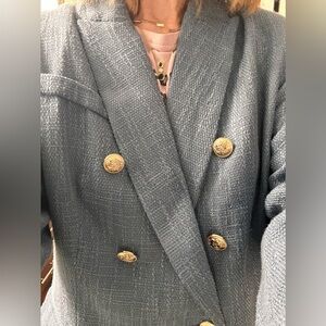 This blazer is fantastic and I wish I could keep it! Says it’s an extra large. I think it would fit a large nicely. The color is a slate blue with a nubby knit texture. Color photographed best in pictures where I am wearing it and in close-up of sleeve that I took to show the color and the fabric. Blazer reminds me of all the TikTok‘s of what the girls are wearing in Paris and New York! This is for the trend center not the follower!!