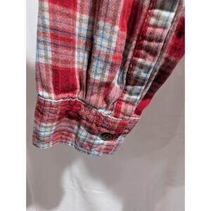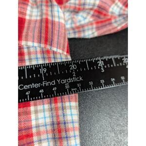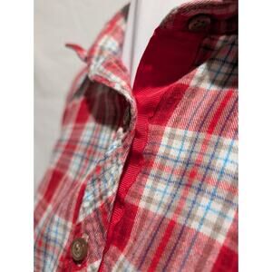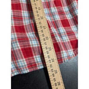 This Eddie Bauer shirt is a Women's Size XL red plaid button collared blouse top in excellent used condition. Made of comfortable cotton material, this long-sleeve shirt features a casual sleeve type, button closure, and a regular fit. Perfect for casual occasions, it also has a Western and outdoor theme, with accents like pockets and wrinkle resistance. The classic red plaid pattern adds a stylish touch to this basic yet versatile top, suitable for all seasons. Perfect for someone looking for a quality and stylish addition to their wardrobe.