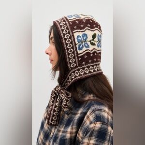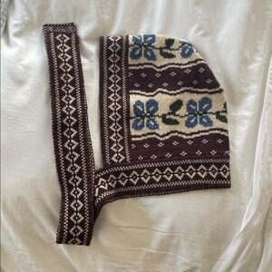 Chic knit hat with floral pattern. Features brown and blue colors. Stylish and cozy.