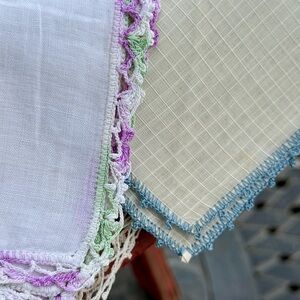 These handkerchiefs represent a bit of what used to be a necessity. Plain fabric was embellished with beautiful and intricate crochet edging. There are a few spots, please see pics! Thanks for looking!