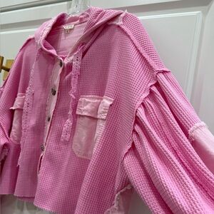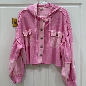 Chic pink jacket by POL. Features waffle knit texture. Super soft and cozy and Ideal for layering. Can be worn open or closed. Beautiful Barbie pink color. Never worn as It was just too oversized for me.